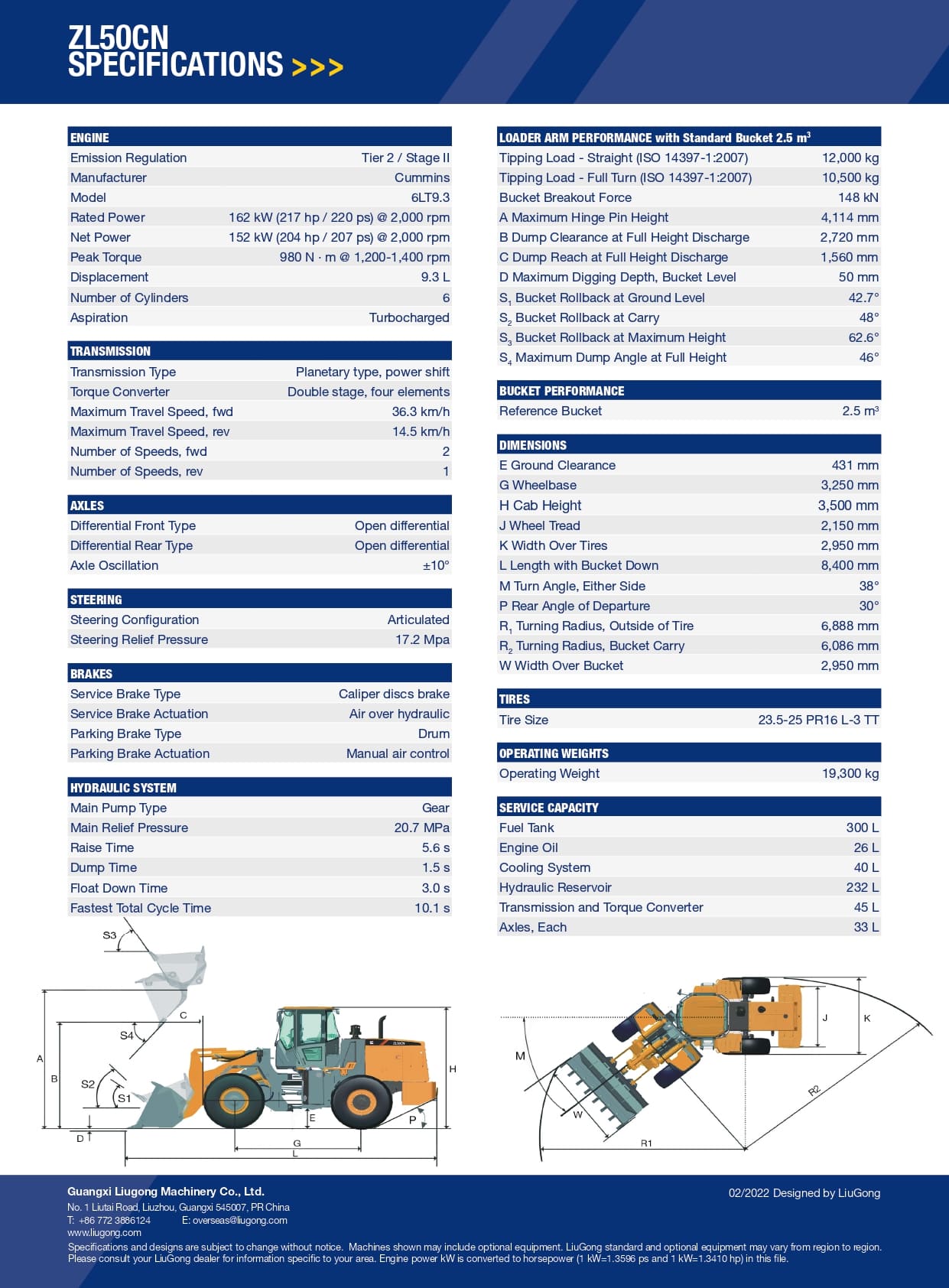 Xúc lật đổ nghiêng ZL50CN được trang bị gầu có dung tích 2,5 m³, phù hợp cho các công việc tải và di chuyển vật liệu hiệu quả. Với động cơ Cummins mạnh mẽ, sản phẩm có công suất lên tới 162 kW tại 2000 vòng/phút, đảm bảo hiệu suất làm việc cao và bền bỉ. Chiều cao xả tải đạt 2720 mm, giúp dễ dàng xử lý các công việc ở độ cao khác nhau. Tổng trọng lượng của sản phẩm là 19.300 kg, mang lại sự ổn định và an toàn trong quá trình vận hành.