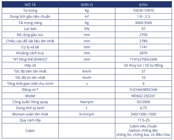 Máy xúc lật LiuGong CLG 835H với dung tích gầu 2,3 m³ là sự lựa chọn lý tưởng cho các công việc xúc vật liệu xây dựng, đặc biệt là phục vụ các trạm trộn có công suất từ 60 - 90 m³/h. Được trang bị động cơ WEICHAI 6 máy với turbo tăng áp, máy mang lại công suất 92 kW, giúp tạo ra lực kéo lên đến 100 kN. Tốc độ tiến lớn nhất của máy đạt 35 km/h, trong khi tốc độ lùi lớn nhất là 14,5 km/h.